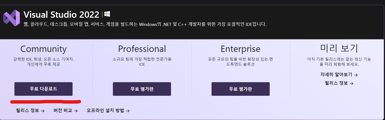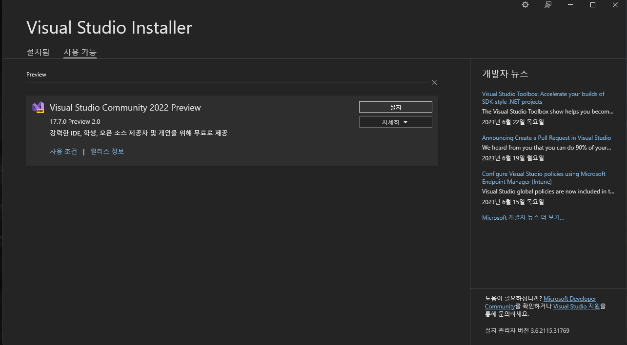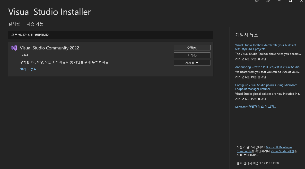 아래의 installer 창에서 본인에게 맞는 visual studio 버전을 다운받으시면